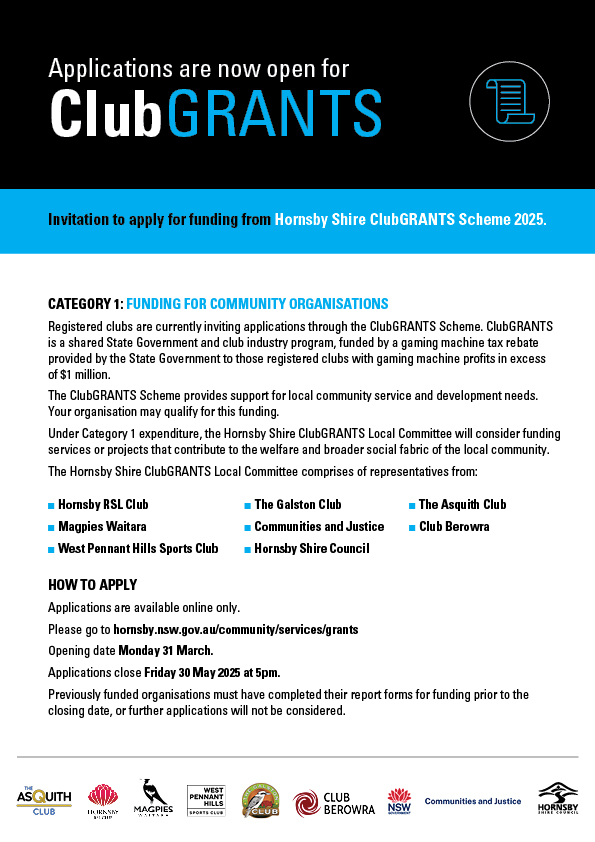 The Category 1 funding round is nearly complete for 2025. Applications were reviewed in June and in July an allocation of funds was made. Recommendations were then provided to the boards of each of the participating clubs (Hornsby RSL, Magpies Waitara, West Pennant Hills Sports Club and The Galston Club) and formally accepted prior to informing successful applicants in approximately mid-August. This year, unsuccessful applicants will also be informed by participating clubs rather than by Council. Thank you to all applicants for the time taken to submit an application.